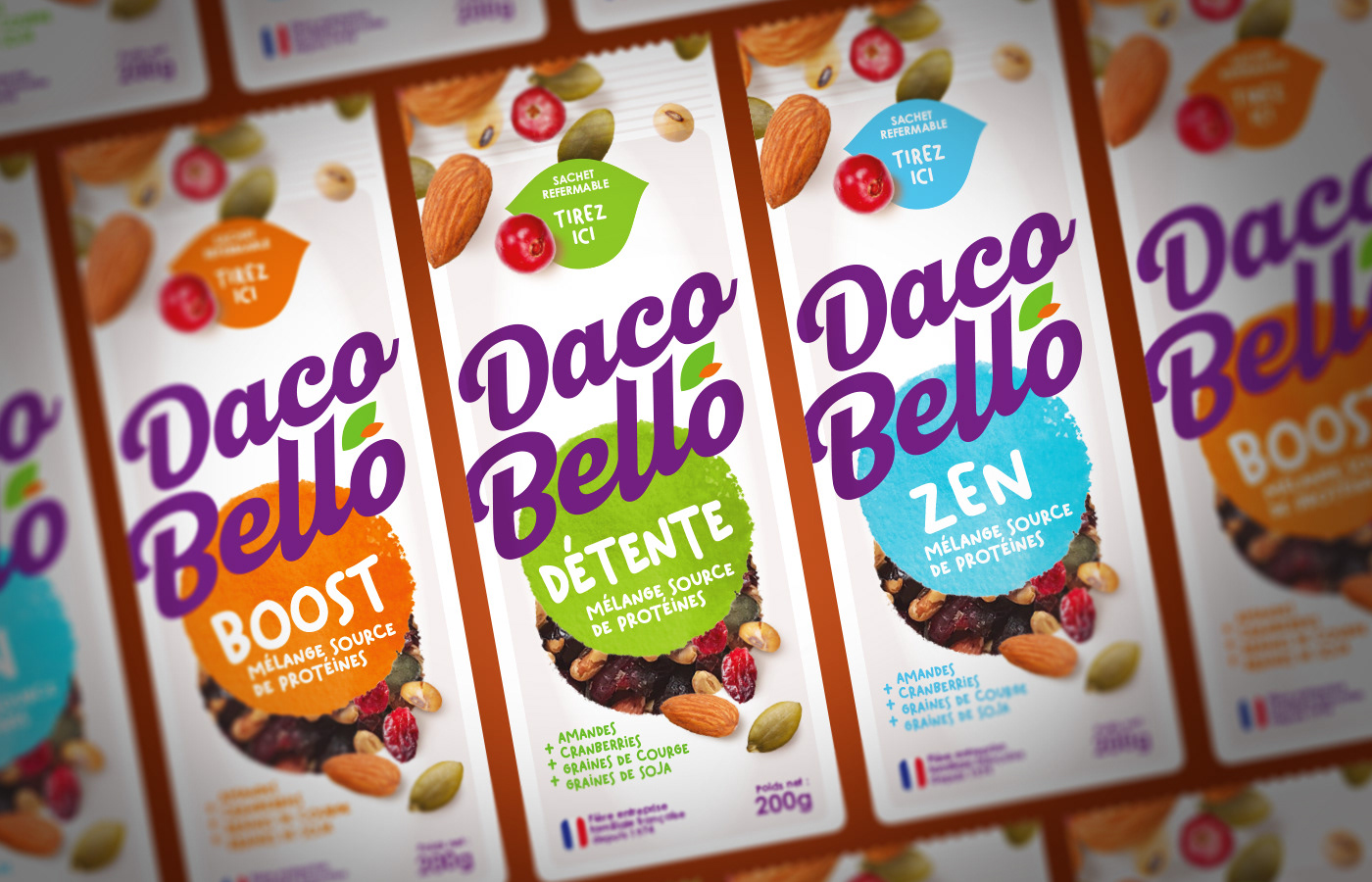 Étude pour lifting complet des packagings Daco Bello, expert en fruits secs depuis 1974. --- Study for complete makeover of Daco Bello packaging, an expert in dried fruits and nuts since 1974. Marque / Client : Daco Bello Agence : Pixelis Paris